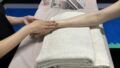 グーパージャンプはいつもはフープを使って前に進みながら行っていますが、今日はスポンジ製の棒を二本使ってジャンプします。