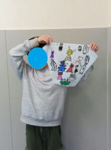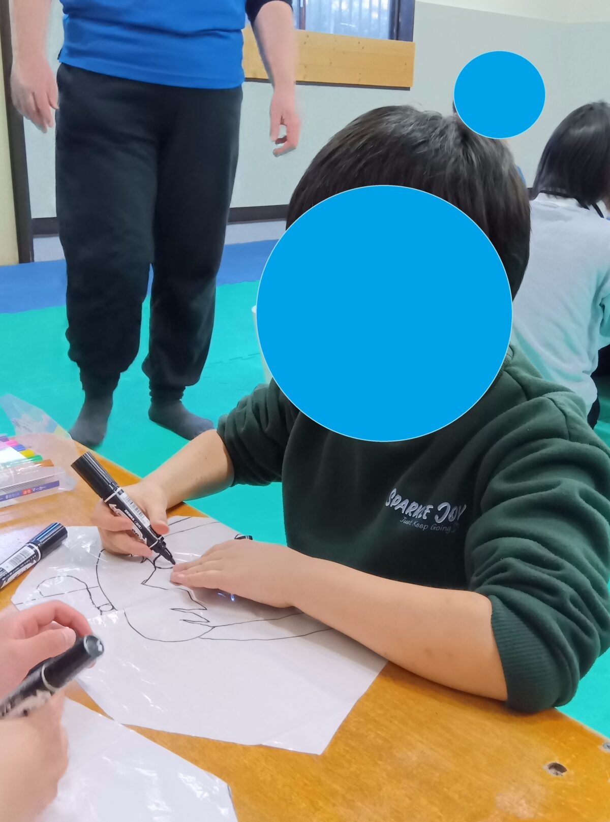 まずは凧の形に切った白いビニール袋に自分の好きなように絵を書きます。